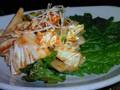 We started off with the spicy kimchi salad. If you love the complimentary spicy kimchi that is served with your meal at Hangawi, then this is undoubtedly the salad for you. A giant mound of the piquant, marinated cabbage atop lettuce greens, it also contained a few slices of apple (all yours, VM), and cucumber (all mine). Topped with crunchy taro sticks, this was a terrific start to our feast